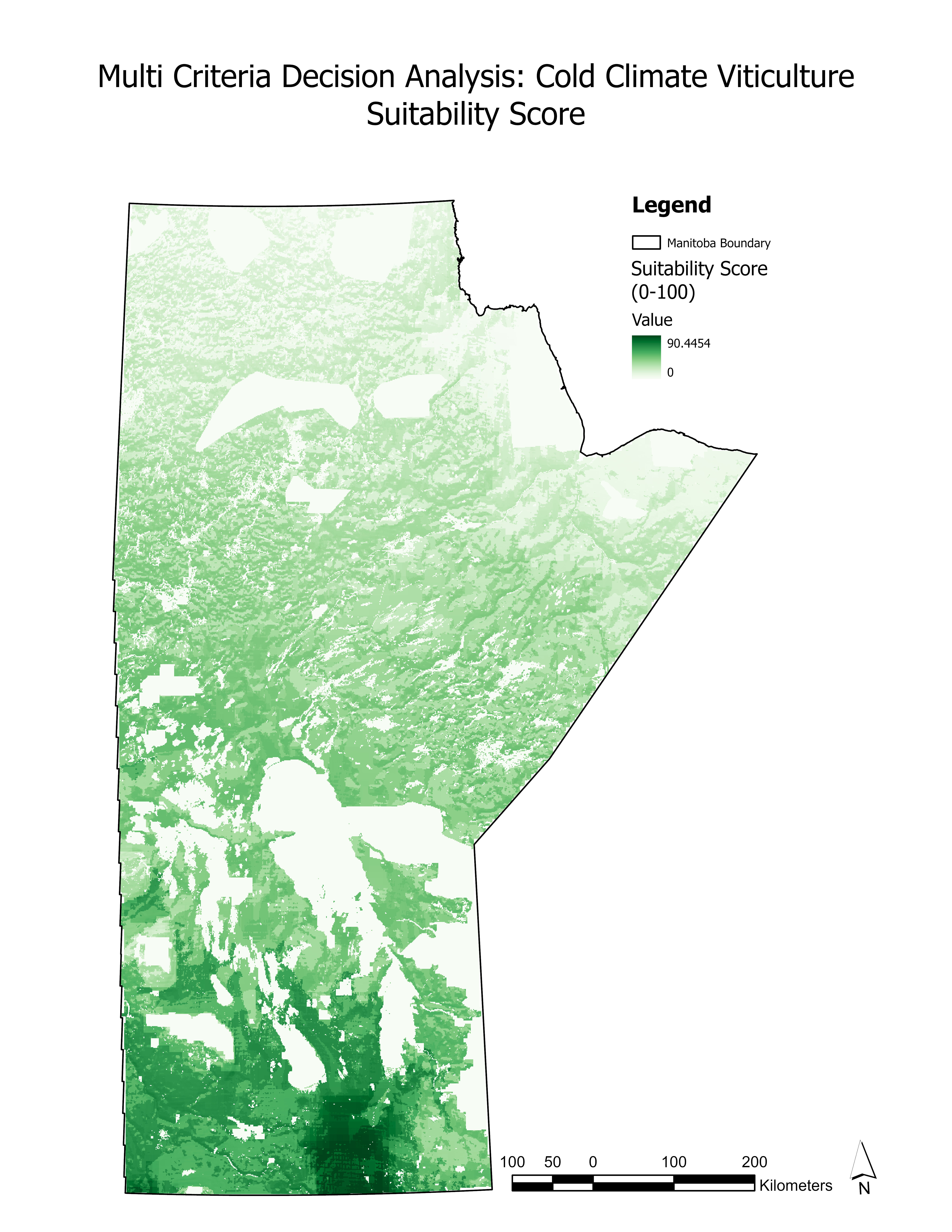 Spatial analysis exploring the cold climate viticulture potential in Manitoba using climate and soil data.