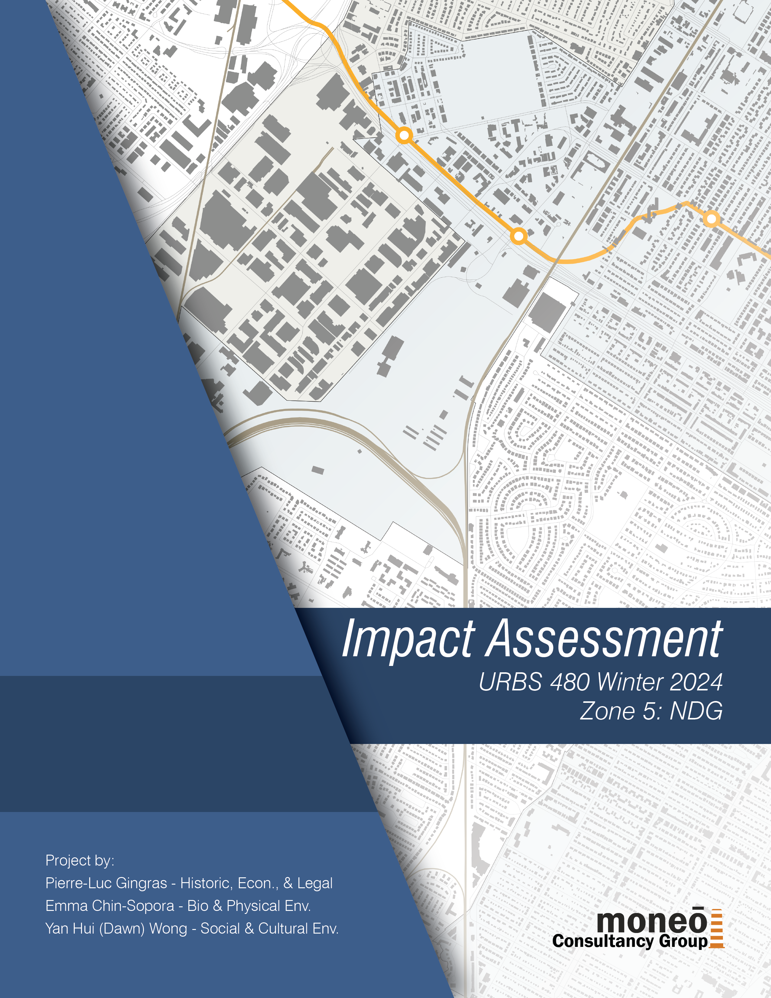 Semester long collaborative project: each teammate focusing on one aspect of the impact assessment. Moneō Consultancy Group (fictional) was developed as a criteria of the evaluation.